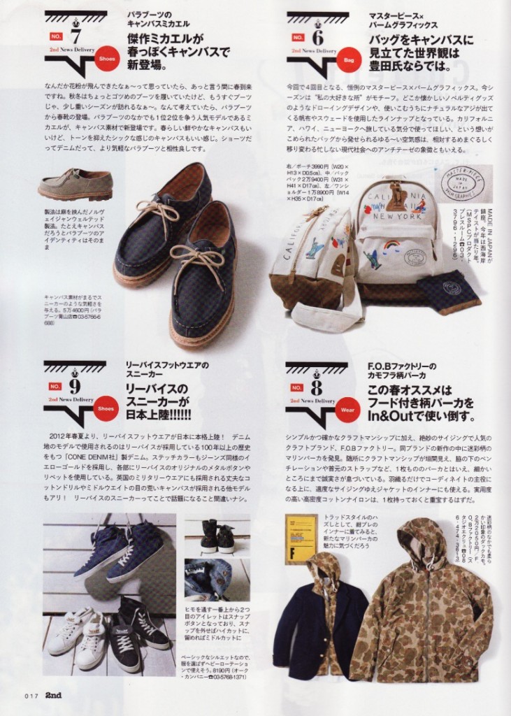 雑誌「 2nd 」5月号に弊社PRブランド、この春に日本・本格スタートした「LEVI’S FOOTWEAR」、「cramp」革鞄カスタムオーダー、「Voler dans le ciel」の帆布バック&パンツをご掲載いただきましたのでご案内。