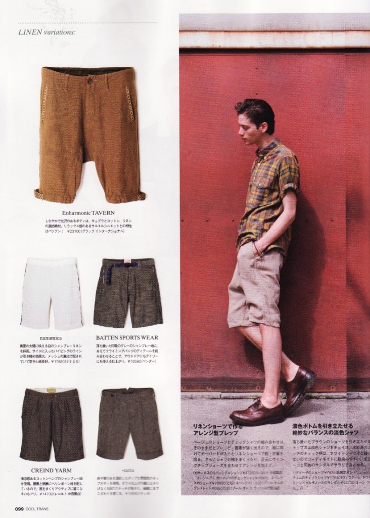 雑誌「 COOL TRANS 」8月号に弊社PRブランドEnharmonic TAVERNのサルエル風リネン混ショーツ、CREIND YARM のシャンブレーショーツをご掲載いただきましたのでご案内。