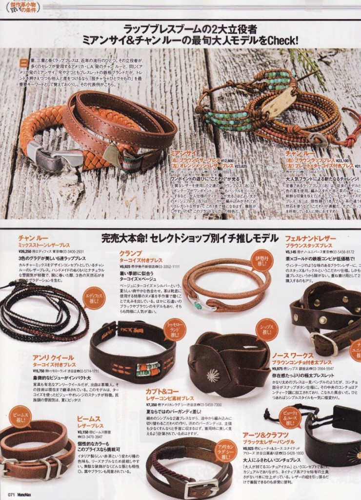 雑誌「 Mono Max 」8月号に弊社PRブランド「cramp」のウォレットロープ、レザーブレスをご掲載いただきましたのでご案内。